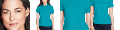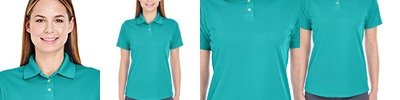 4.8 oz., 100% polyester mini-jacquard; Anti-bacterial; Anti-static; Moisture-wicking; Stain-resistant; UV protection; Feminine fit; Flat-knit collar;